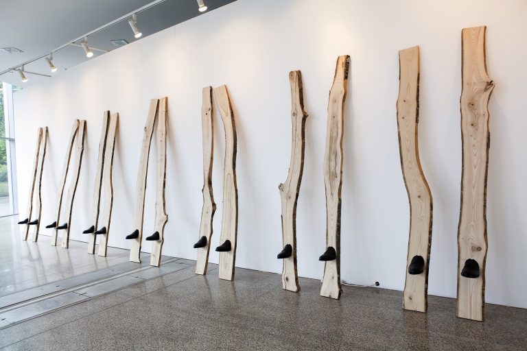 Distances and Destinations, l’opera presentata a Trieste da Algis Kasparavičius (artista coinvolto nella collezione Imago Mundi dedicata alla Lituania presente nella mostra), esplora il tema di “Identità e Alterità” indagando la relazione tra le aspettative verso noi stessi e la realtà: le “destinazioni” sono gli obiettivi che ci poniamo; le “distanze” indicano invece gli ostacoli a questi traguardi. Nell’installazione di Kasparavičius, le assi di legno rappresentano la ricerca personale che involontariamente si trasforma in autoesilio: le scarpe nere fissate alle tavole restano immobili, incapaci e impossibilitate a raggiungere la propria destinazione.