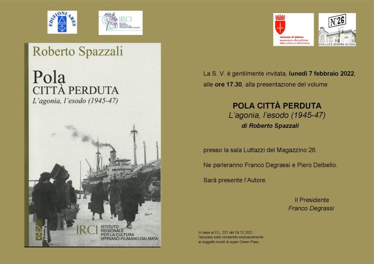 Lunedì 7 febbraio 2022 – Sala Luttazzi (Magazzino 26) dalle ore 17.30Presentazione del volume POLA CITTÀ PERDUTA. L’agonia, l’esodo (1945-1947) di Roberto Spazzali, realizzato dall’I.R.C.I.